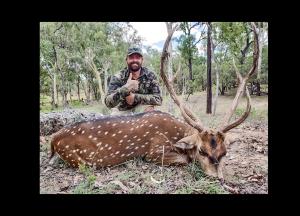 Greg has previously shot around eight trophies and record chital with me here, so it’s decided I will have a go first and if the opportunity arises Ryder will have a go! The area I hunt Chital is mostly dry hard sparse country with occasional clumps of trees so these trees is the location spend most of the morning glassing. At around midday a large mob was located in the shade and after a little time looking we made out a great looking set of antlers amongst the mass of does, spikes and one or two young stags. We moved in for a quick, successful stalk, a good shot by yours truly and a bloody awesome stag is on the deck. The walk back to the truck tested young Ryder’s minimal experience a good stalk, but a missed opportunity saw another great chital trophy make for greener pastures something for the young bloke to look forward to on his next adventure.