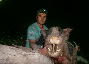 Luka started barking hard. I knew it was a good one. Eloise would have woken in the middle of nowhere to me running off into the darkness screaming back at her “THERE ON, LET IVORY GO”. After a hundred meters or so I knew she had woken because Ivory tore past me in the darkness knocking me to the ground, later realizing he made me drop my knife from my pouch. When I got there, Rocko and Ivory were on the ears of solid black and white boar with Luka fighting with him from front on. Starting to get worried about the dogs I grabbed his legs to help them out. I could see Eloise’s headlamp bobbing through the tall grass behind me I screamed a few “boyfriend encouragement words” at her so she would get to me faster. After she finished him off we admired his little hooks, gave the dogs a well-deserved pat and grabbed a couple of photos. We headed back to camp for a sleep before the long drive home. I am very proud of how much the pups skills are improving, and the boar they got was about 75kg, a good way to end a great trip with a total of 12.