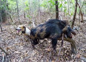 I watched the tracker as the boar hit the side of the valley and started climbing with the dogs getting a steady bail around the kilometers mark. Pigs around here are hard to bail on a hillside and know that they can usually beat a dog-headed downhill through the forest. Just as I reached the bottom of the mountain the dogs were bailing, I checked my tracker to see them both coming downhill flat out I stopped and listened hearing a new bail erupt only a hundred or so meters away. I bashed and slashed my way to within 30m then dropped my machete to sneak the rest of the way in with the 3030 so he wouldn’t spook and break. Spotting him in a bit of a ditch I had to wait for a clear shot which seemed to take forever as he spun trying to face the dogs at all times. Finally, the shot presented itself and I drove the pig straight through the pine in his neck dropping him instantly. Upon closer inspection, I realized just how big this pig was and would have to be close to the 130kg mark making it my largest pig to date. But with no way to weigh him, I got a couple of photos with the dogs behind him and proceeded to make my way the last km or two back to the car without any more pigs. Not many numbers but definitely a pig to remember.