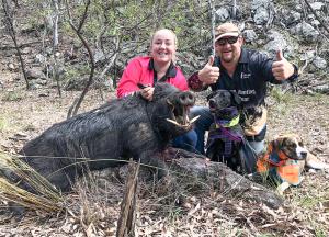 Having these basics on your person ensures that if you end up a few kilometers or even just a few hundred meters in the mountains away from the quad or ute, you can still treat the dogs and get them stable to walk back to the quad. We also make sure to carry a rifle with us too. You never know what kind of pig the dogs may have or what you are going to come across when walking. If you are licensed and are able to carry one, a small caliber rifle could get you out of some potentially hairy situations if need be. Another thing we do to ensure the safety of our dogs while hunting the mountains is never going solo. By hunting in pairs or in a small group means that if something happens to one of the dogs you can carry them out. With our dogs on the verge of finding, we tend to do as much walking as we can. Walking creeks and to the top of traprock mountains covered in prickly pear. Knowing that pigs love these type of areas it makes targeting specific locations easier. Also, by having slightly smaller dogs makes hunting the mountains a bit easier as they have the agility to run through the thick bush and maneuver around the fallen trees. But getting there ourselves before the dogs lose the pig is one of the challenges. Jumping over fallen trees, weaving through cactus and crawling through the thick bush is the main struggle when you’re trying to get to the dogs as quickly as possible. But when you eventually get there and dispatch the pig, the views that greet you don’t get much better! Hunting the mountains may not be the easiest nor the safest, but it sure is rewarding in more than a few ways.